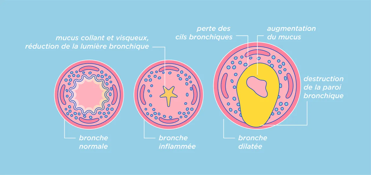 La persistance d’un mucus pathologique abondant dans les voies aériennes pulmonaires altère significativement la fonction pulmonaire et la qualité de vie. Elle contribue à l’aggravation des symptômes respiratoires (toux chronique, expectoration, gêne thoracique et essoufflement). En outre, elle favorise les infections respiratoires, l’inflammation et le développement de la maladie.